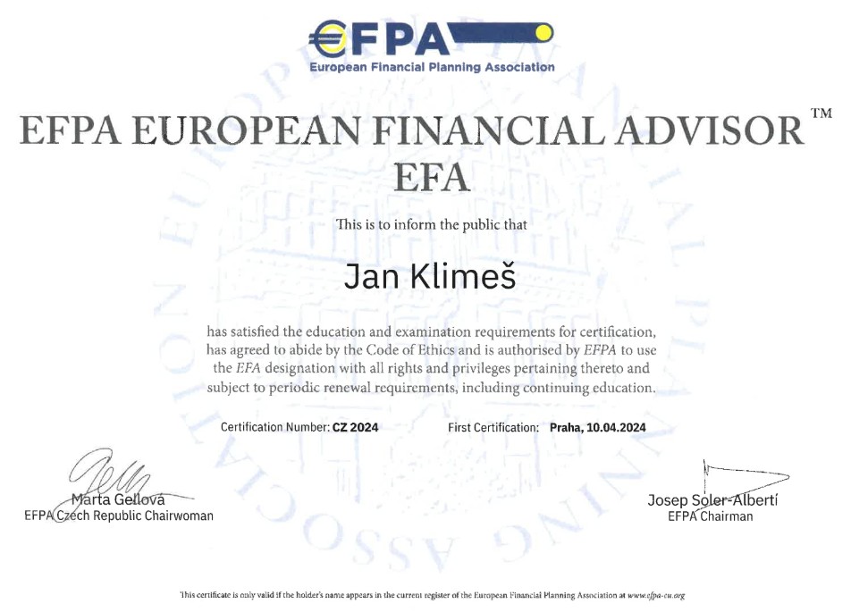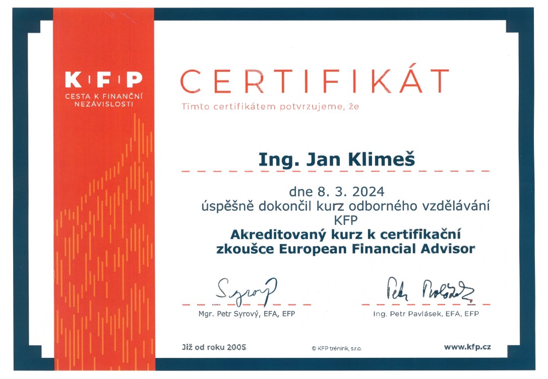 - Absolvent přípravného ročního kurzu KFP na prestižní evropskou certifikaci EFA